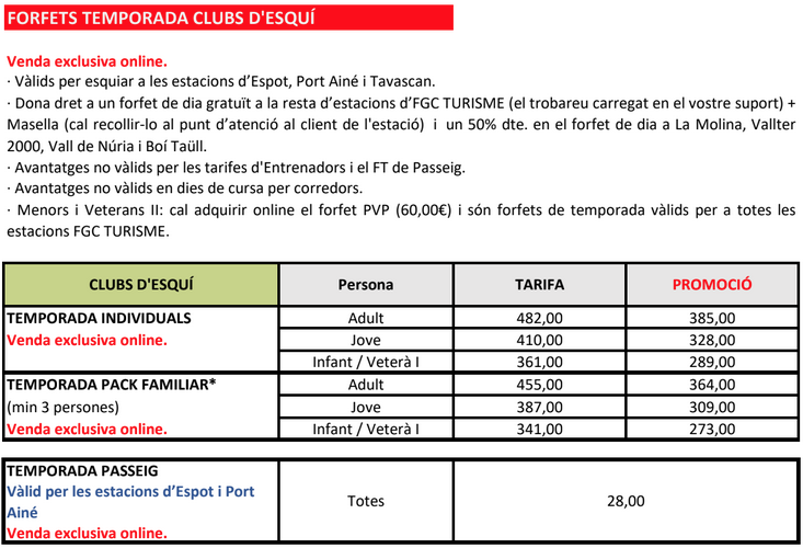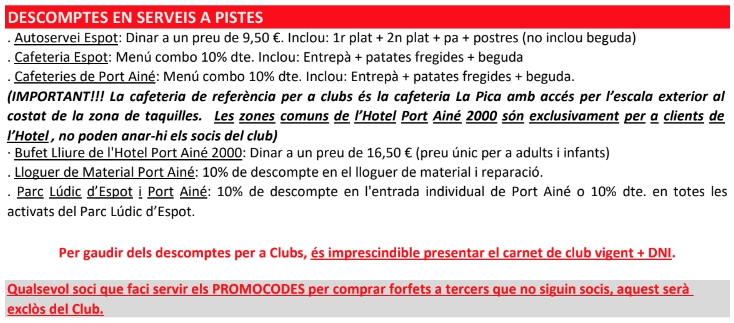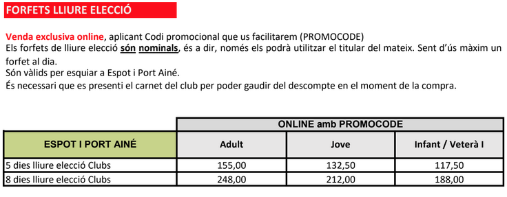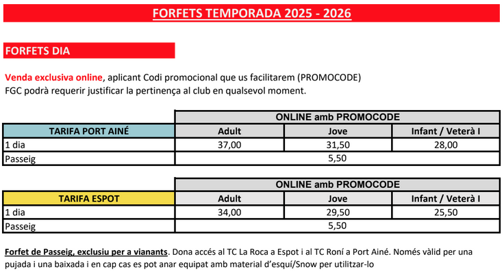 Tarifes i condicions per adquirir forfets per a les estacions SkiPallars Portainé i Espot per als socis del Club per a la temporada 2025-2026